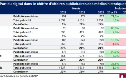 Selon le BUMP, la part du digital bondit dans tous les médias, pour atteindre en moyenne 17 % des recettes, soit quatre…