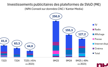 Les investissements publicitaires des plateformes de SVoD plongent en 2025 : à fin septembre, ils atteignent 127,2 M€, soit près de moitié…