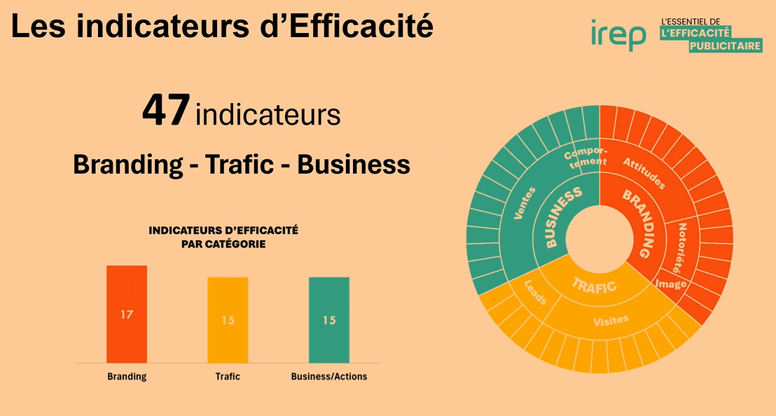 Ces indicateurs ont été répartis en trois grandes familles : le branding (impact sur la perception de la marque en termes de notoriété, d’image, d’attitudes…), le trafic (mesure de la fréquentation avec les visites et les leads…) et le business (mesure de l’impact commercial avec les ventes, la consommation, les comportements…).
