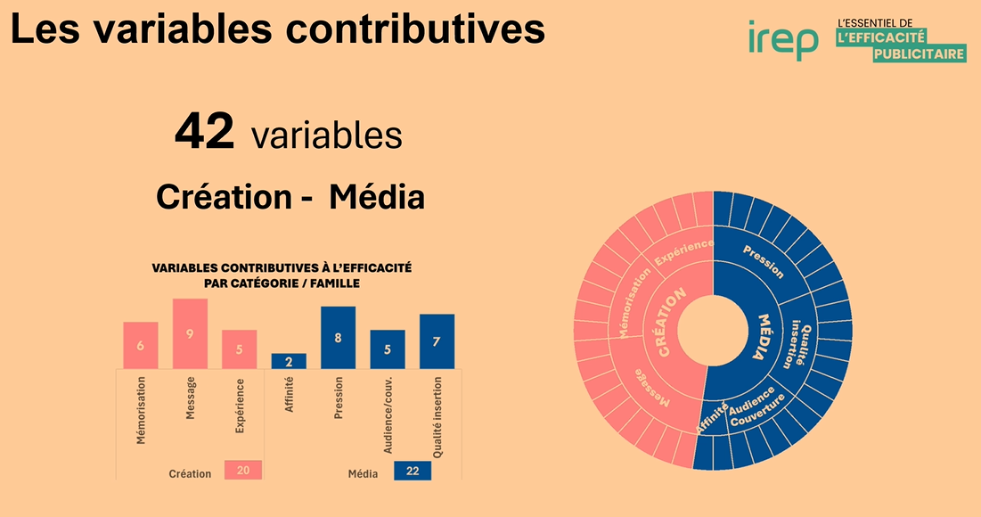 Ces variables sont nécessaires pour que l’efficacité fasse son chemin mais ne permettent pas à elles seules de savoir si les objectifs marketing d’une campagne ont été atteints. Parmi ces 42 variables, 20 sont en lien avec la création (message, expérience, mémorisation) et 22 avec le mix-média (affinité, pression…)