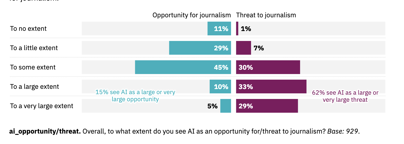 Environ 62 % des personnes interrogées considèrent l’IA comme une menace importante, voire très importante, pour le journalisme, contre 15 % qui y voient une opportunité importante, voire très importante.
