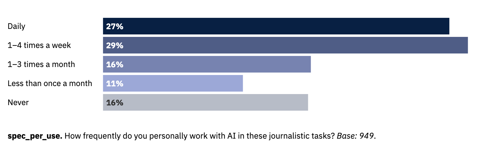 On obtient le total de 83% d’utilisateurs de l’IA en ajoutant les 27 % de journalistes qui l’utilisent moins souvent. Parmi eux, certains utilisent l’IA 1 à 3 fois par mois, d’autres moins d’une fois par mois. Seulement 16 % n’ont jamais utilisé l’IA pour des tâches journalistiques.