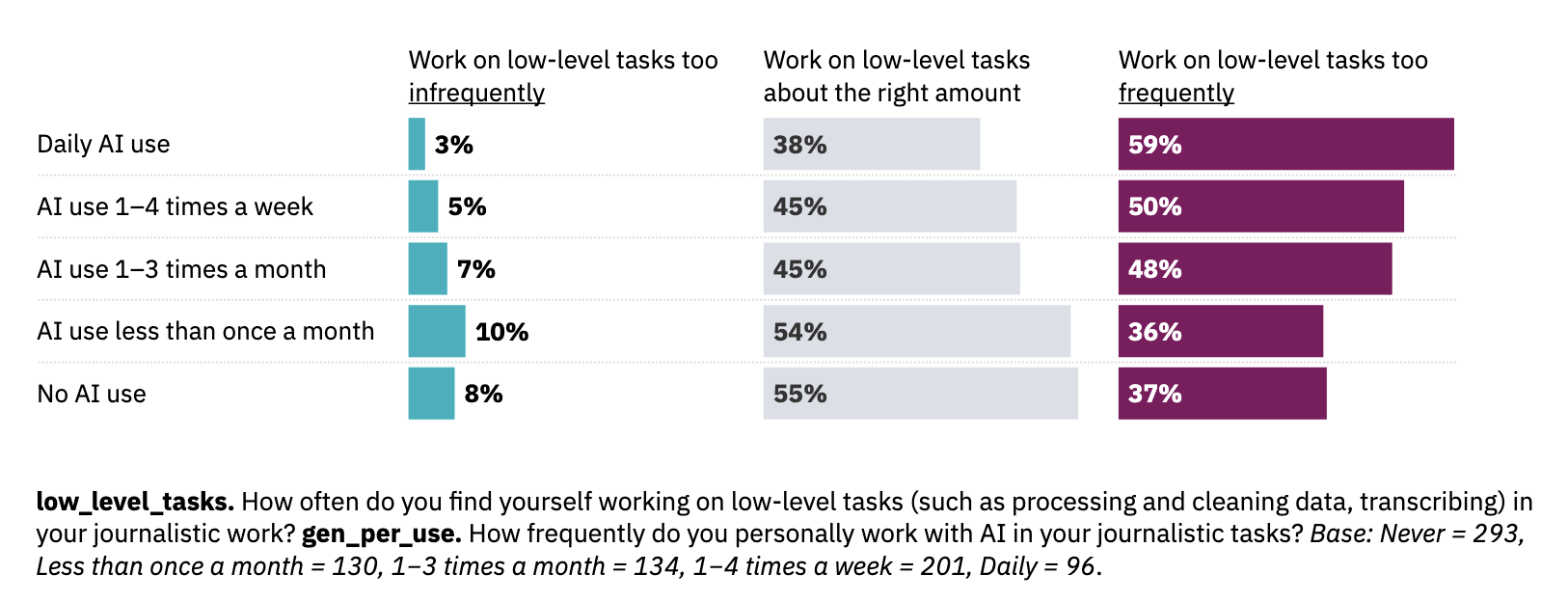 Parmi les journalistes qui utilisent l’IA quotidiennement, 59 % estiment qu’ils travaillent trop souvent sur des tâches de faible niveau, un chiffre bien supérieur aux 37 % de journalistes qui n’utilisent jamais l’IA et qui partagent cette opinion.