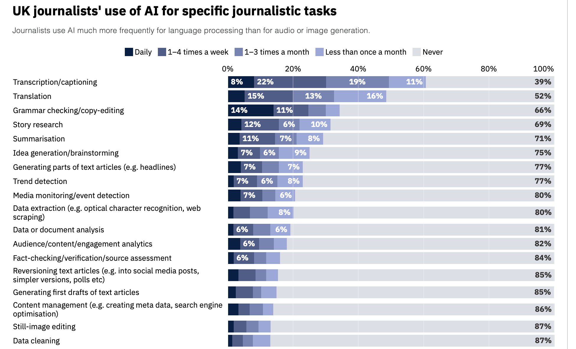 Le premier enseignement, c’est que l’usage de l’IA par les journalistes est massif. Sans doute nettement au dessus des usages de la population anglaise qui avoisinait les 36% en mai 2024.