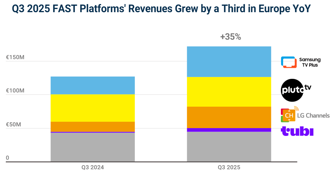 Les plateformes de constructeurs Samsung TV Plus et LG Channels ont chacun ont chacun généré plus de 15 M€ supplémentaires et ont été de loin les principaux contributeurs à cette croissance. Tubi (Fox, uniquement présent en Europe au Royaume-Uni) et Pluto TV (Paramount) se situent d’après Dataxis aux troisième et quatrième places, en termes d’augmentation de leurs recettes.