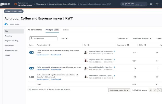 Les marques pourront supprimer ou modifier des prompts sur leur console publicitaire. Elles pourront aussi voir le nombre d’impressions et de clics. Sur les captures d’écran fournies par Amazon, une colonne « dépenses » est pour le moment vide. Elle prouve cependant que la société prévoit bien de monétiser ces nouveaux formats une fois la phase bêta terminée.