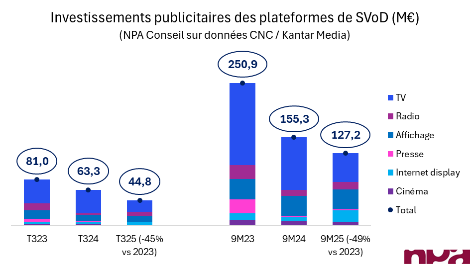 A la fin du 3e trimestre, les plateformes de SVoD totalisaient 127,2 M€ d’investissement en publicité sur neuf mois en 2025 (données brutes Kantar Media publiées dans le Baromètre de la publicité cinéma et SVOD du CNC), soit une baisse de -49 % par rapport aux 250,9 M€ de 2023, et -18 % par rapport à 2024 (155,3 M€).