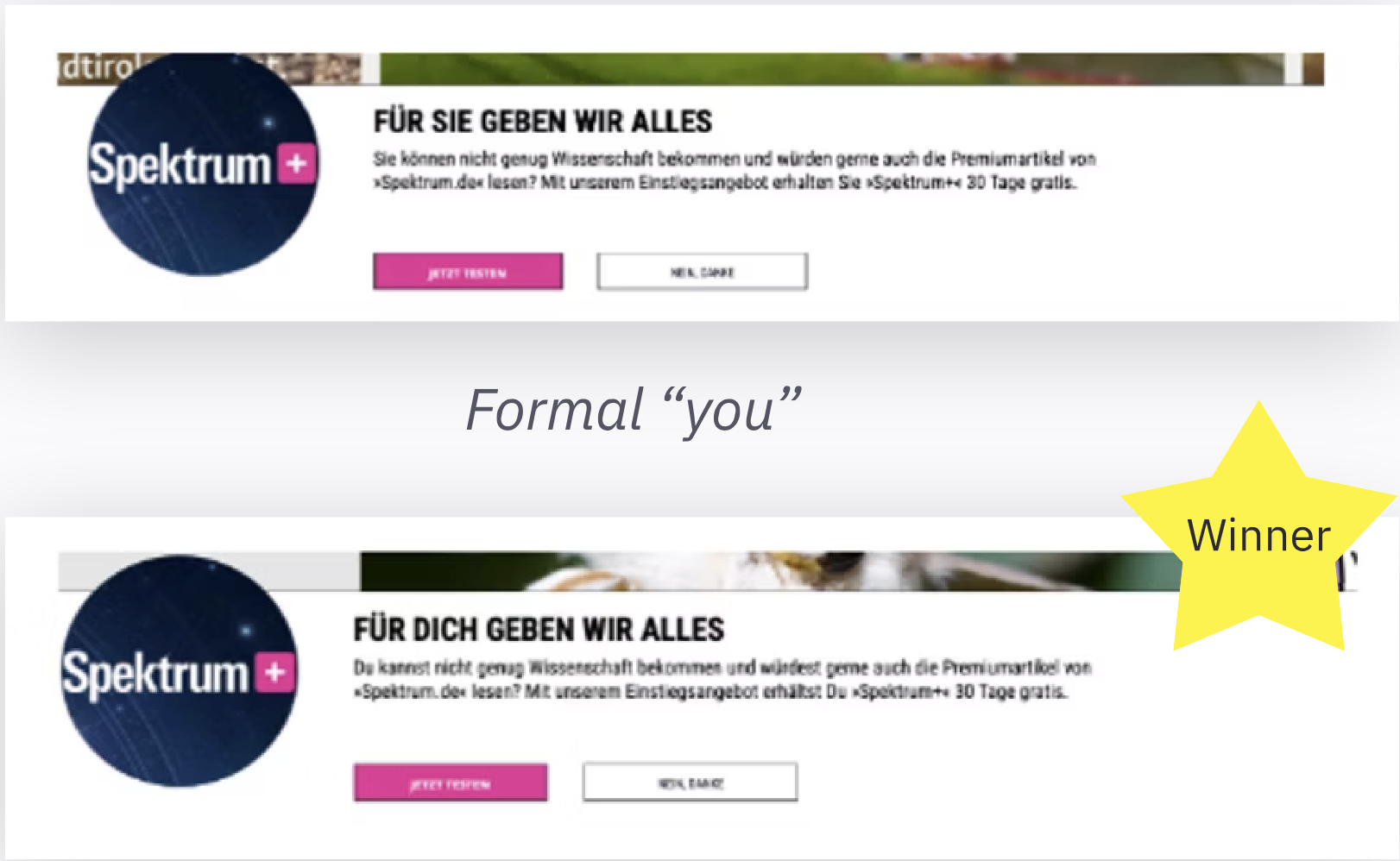 Un même message ne fonctionne pas partout. L’éditeur de magazine scientifique allemand Spektrum a comparé l’efficacité de deux messages diffusé à un public en provenance de Facebook