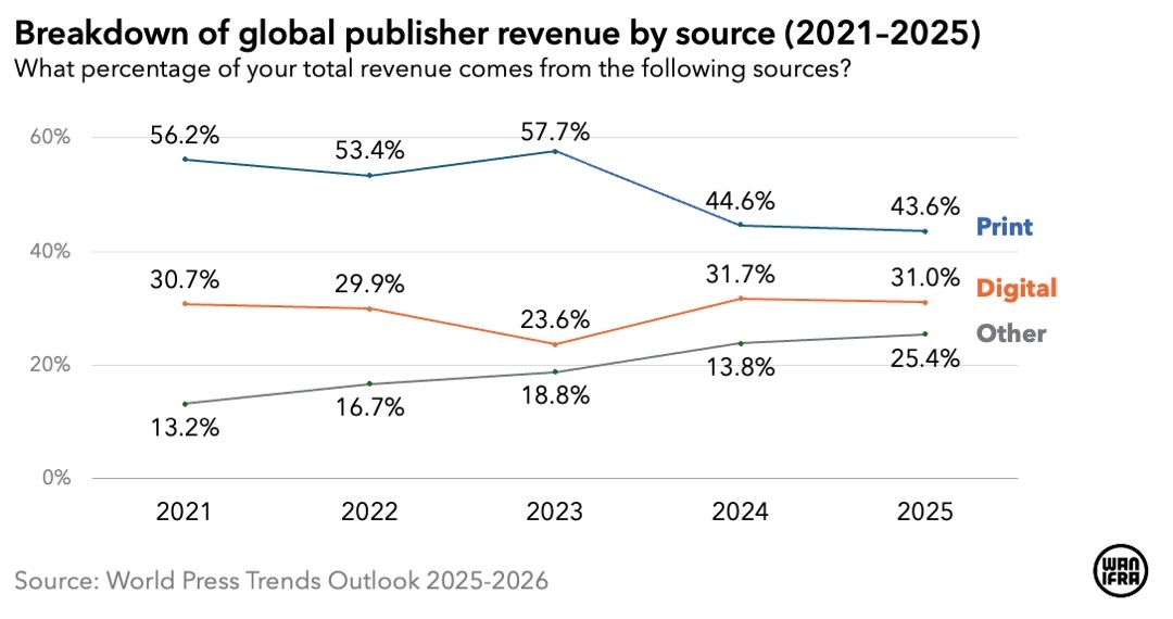En 2020, la publicité imprimée et les ventes de journaux papier représentaient ensemble 56,2 % des revenus des éditeurs. En 2025, cette part est tombée à 43,6 %.
