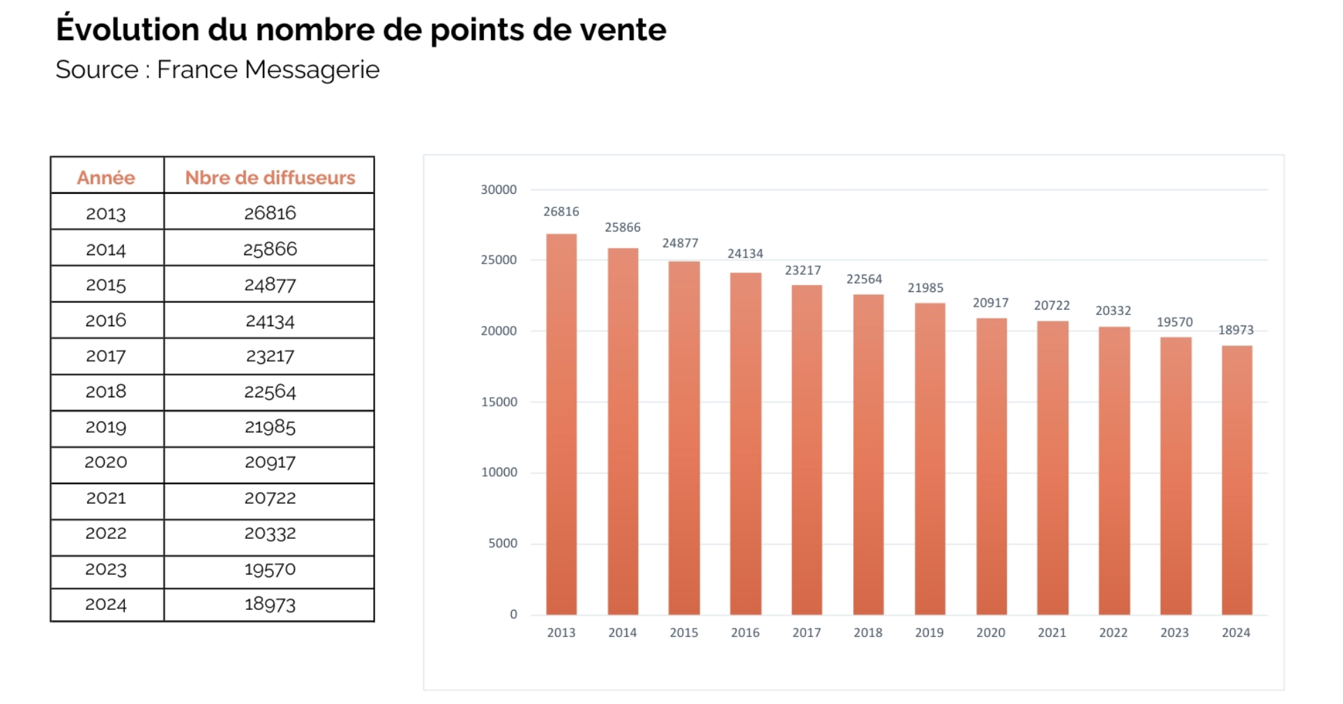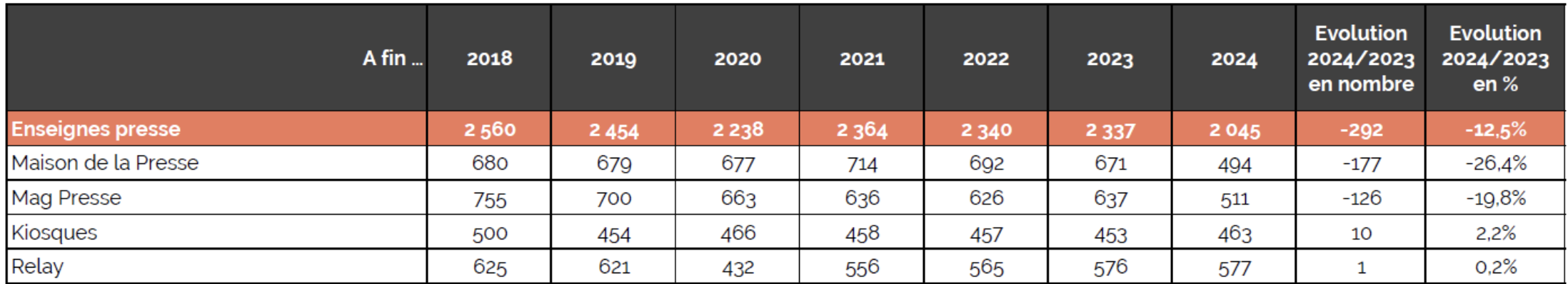 La baisse du nombre de points de vente de presse est structurelle et continue (cf ci-dessous). J’ai demandé à Marc Bollaert, DG de Mediakiosk, entité dédiée de JCDecaux, ce qu’il en pensait.