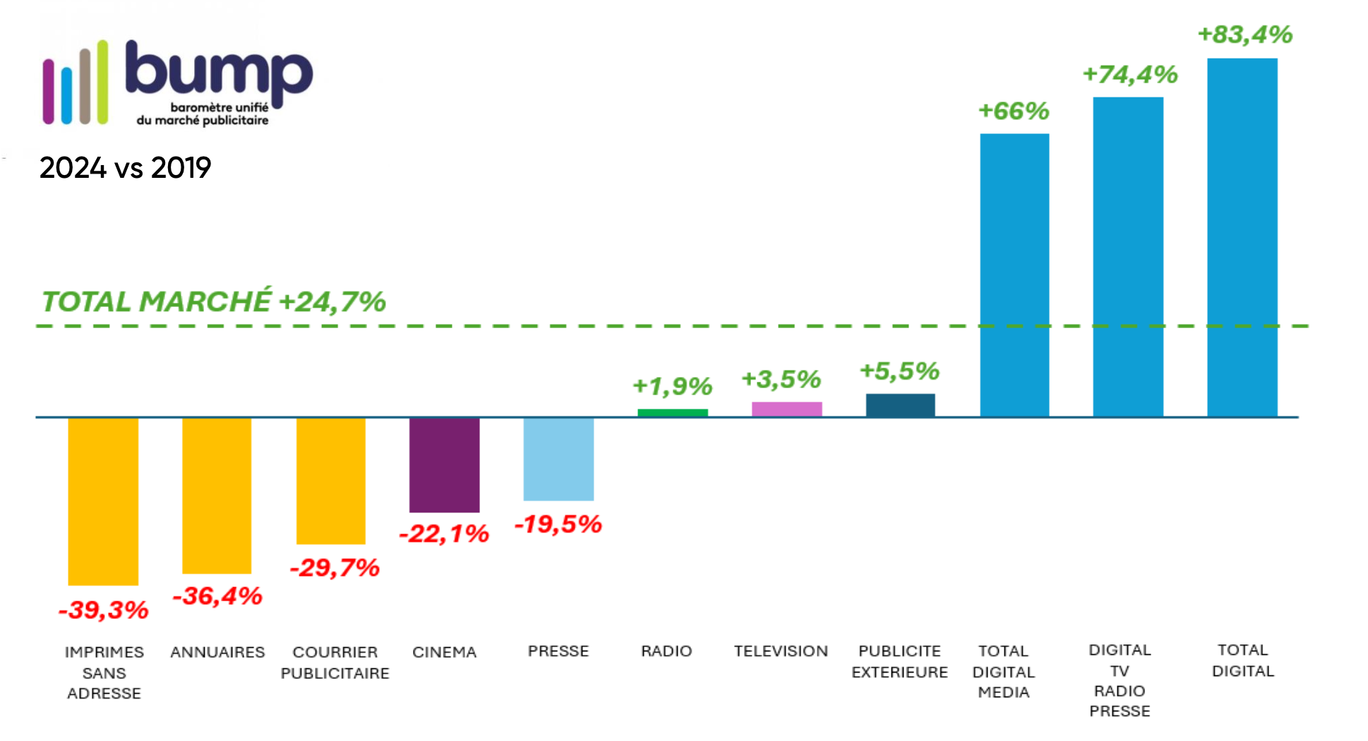 La publicité extérieure résiste mieux que tous les autres médias traditionnels. Selon le BUMP, elle a progressé de 5,5% en 2024 vs 2019, contrairement à tous les médias « historiques » qui déclinent. Au premier semestre 2025, elle encore cru de 0,3 % quand la presse et la télévision reculent.