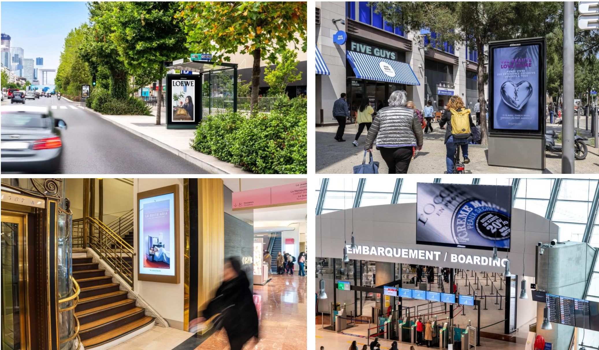 – La Défense reste le site vitrine historique : cinquante écrans sur le parvis et la circulaire, mobilier éco-conçu, habillages de bâtiments…