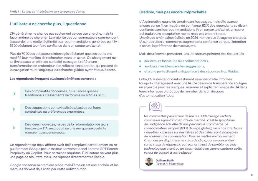Des comportements appelés à se généraliser, selon Guilhem Bodin, partner AI & agentique de Converteo qui a participé à la réalisation de ce livre blanc : « On va se rendre de moins en moins compte que nous utilisons de l’IA générative, au fur et à mesure que les LLM vont s’intégrer à l’expérience des sites e-commerce, comme avec Rufus sur Amazon (assistant d’achat intelligent, ndlr), ou des moteurs de recherche, à l’image de ce que proposent Overview et l’AI Mode de Google en dehors de la France. »