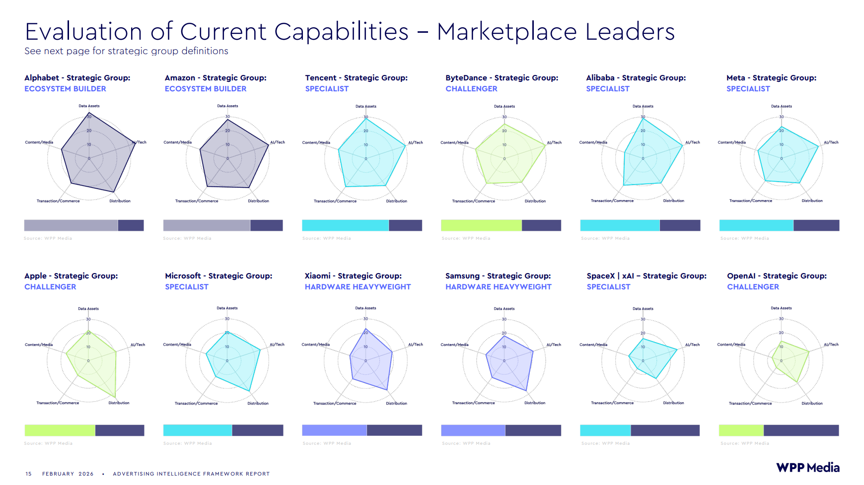 Quid de Meta, Microsoft et X ? Ces acteurs sont considérés par WPP Media comme des spécialistes : ils se distinguent par leur expertise dans un domaine spécifique, mais doivent s’appuyer sur des partenaires pour combler leurs lacunes. Faute d’être des acteurs mondiaux, les Chinois Alibaba et Tencent sont également classés dans cette catégorie.