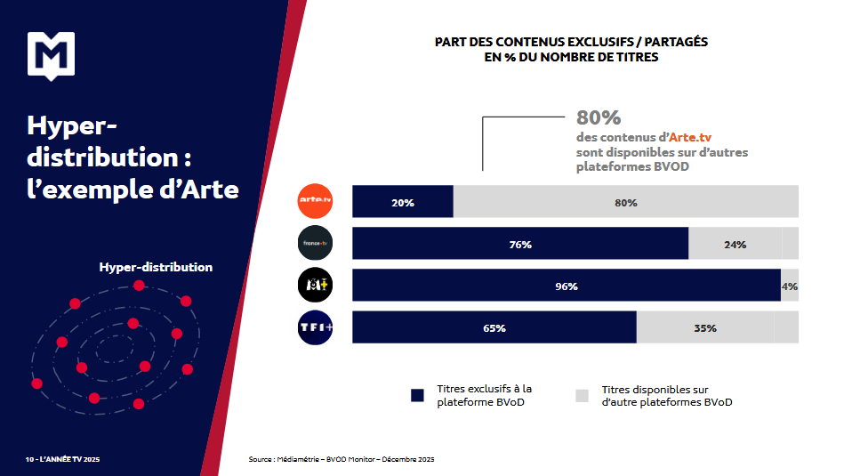 L’hyper-distribution s’affirme comme une stratégie de choix pour les broadcasters et les plateformes BVOD, à l’exception de M6+. Des évolutions très rapides ont eu lieu dans cet écosystème en 2025 : france.tv a progressivement accueilli les contenus des autres acteurs du service public, TF1+ a continué d’étendre sa proposition, avec notamment un corner dédié aux programmes de la chaîne L’Equipe et même arte.tv.