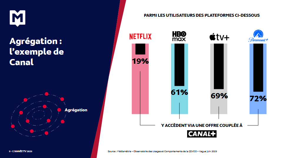 La stratégie d’agrégation amène aussi un vrai bénéfice en matière de visibilité et d’accessibilité, comme le montre l’exemple de Canal+, mis en avant par l’étude de Médiamétrie.
