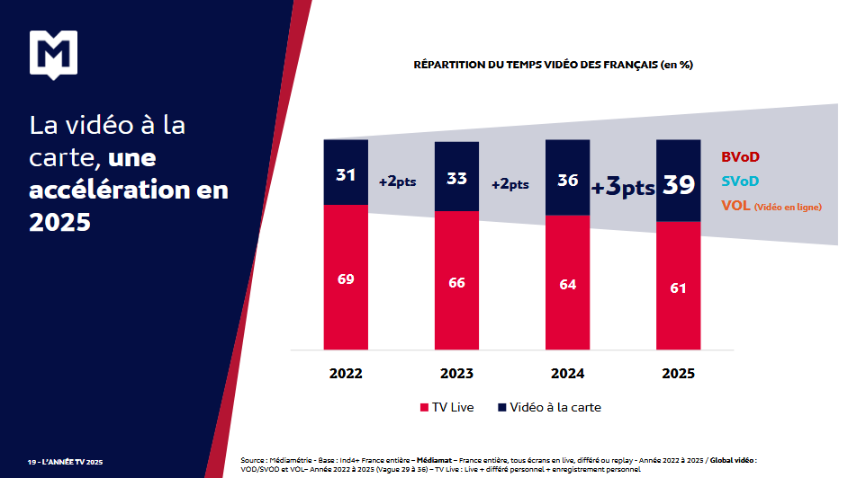 Sur le gratuit ou le payant, c’est la consommation à la carte qui prend de plus en plus d’importance : « Cette tendance s’est accélérée cette dernière année. Elle est portée par les 35-49 ans, dont le temps de vidéo à la carte a progressé de 127 % par rapport à 2023, mais aussi par les plus de 50 ans, chez qui ce temps a progressé de 21 % en deux ans », a détaillé Isabelle Maurice, directrice Insight.