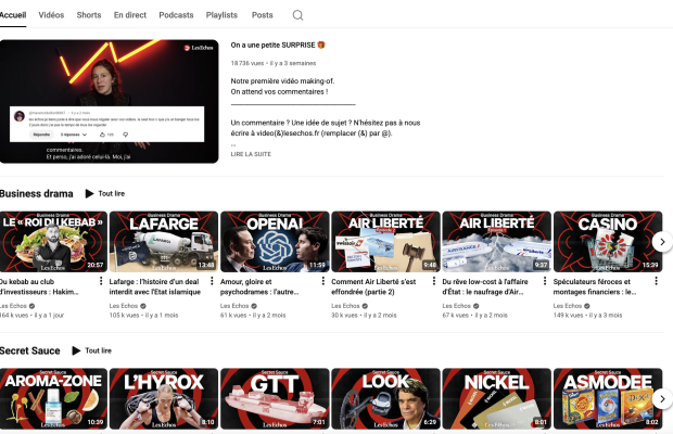 Exemple : Les vidéos à succès créées par Les Echos sont aussi le résultat du recrutement de jeunes journalistes qui ont su inventer des formats sur Youtube qui leur plaisaient. Résultat : ça plaît aussi à un public plus jeune. Et on est sur des formats plutôt longs : de 7 à plus de 20 minutes !