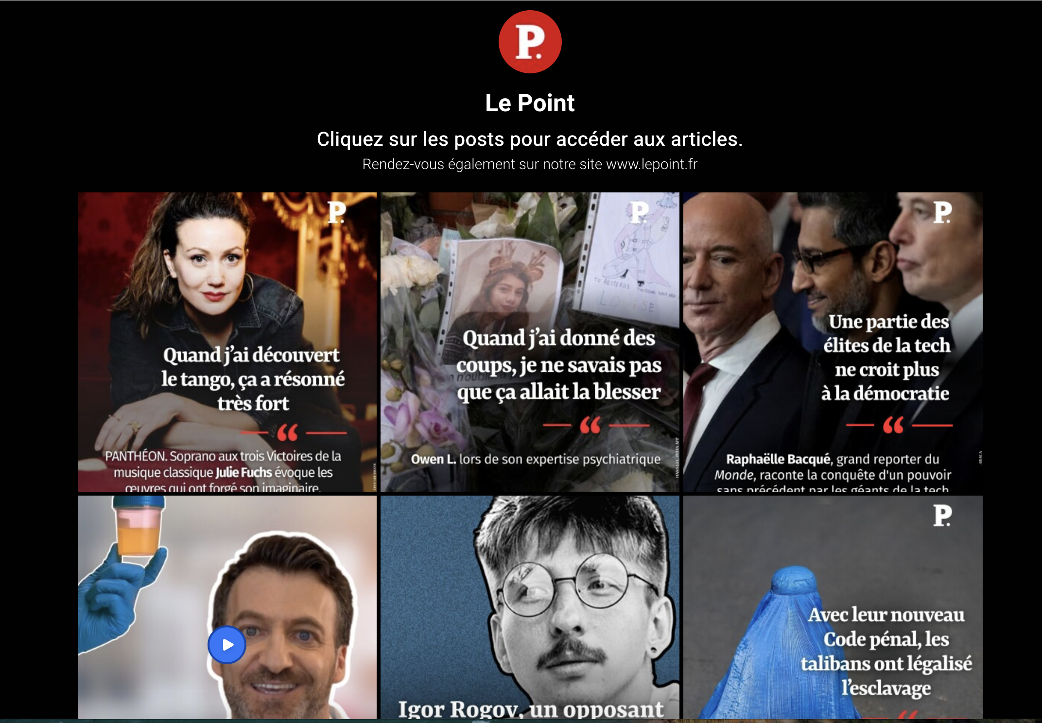Exemple : Sur Instagram, Le Point renvoie vers son site à partir d’une page de sa bio qui reproduit l’ensemble de ses publications. Une façon de contourner la limitation du réseau qui empêche de faire des liens externes dans les publications.
