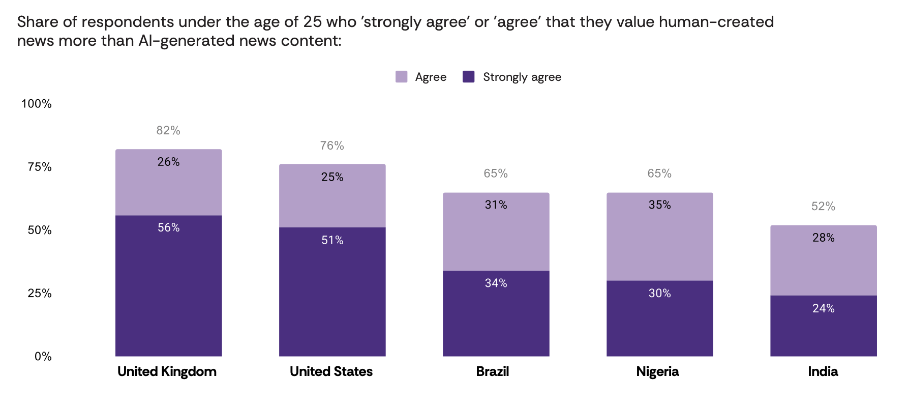 50 % des jeunes de 18 à 25 ans interrogés trouvent l’IA utile pour la comprendre les nouvelles. Entre 42 et 48% d’entre eux trouvent l’IA utile aussi pour résumer une histoire ou donner du contexte et des explications.
