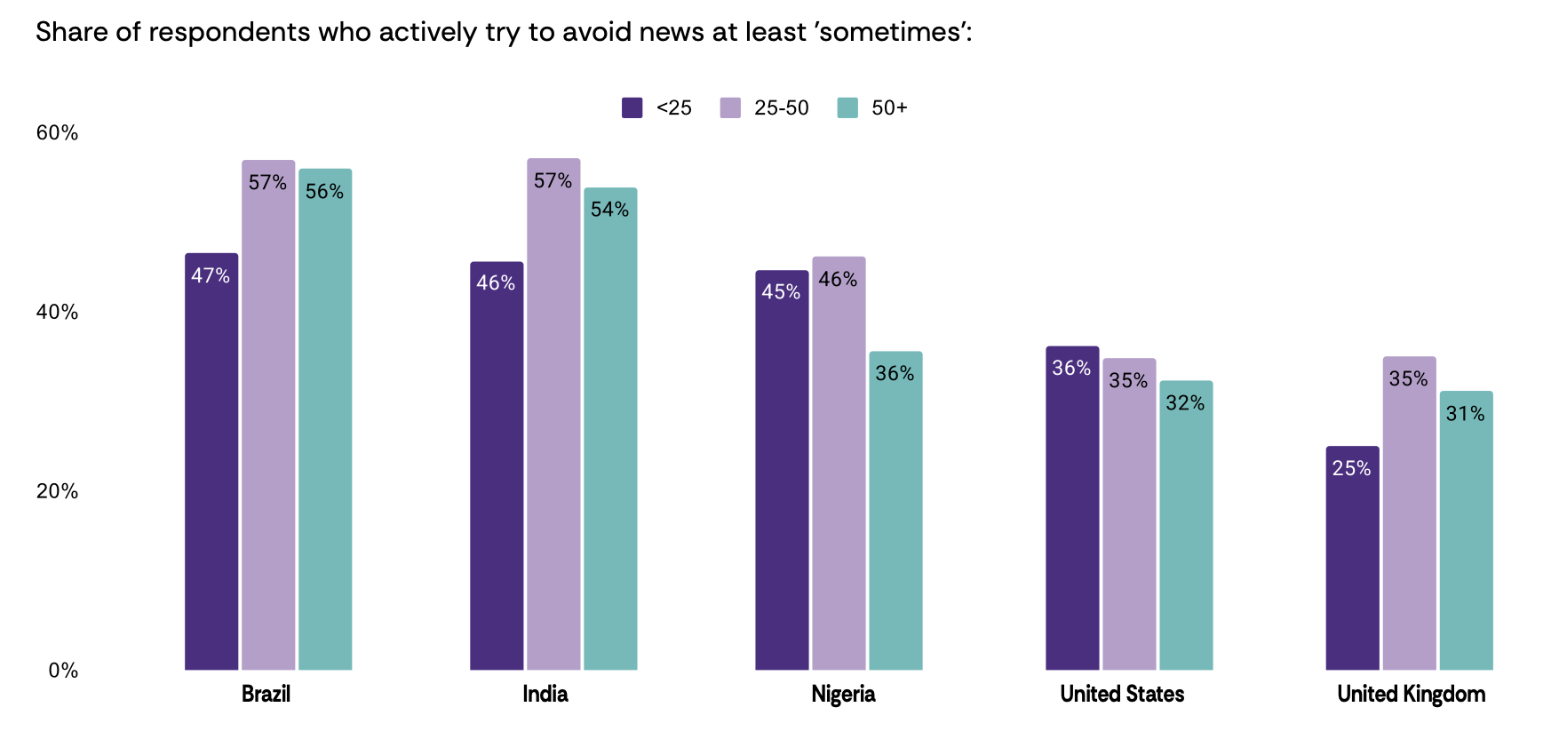 Les questionnaires qualitatif tendent à montrer que les 18-24 ans évitent l’info surtout quand elle ne propose aucune issue. Mais en réalité, ils fuient plutôt moins les news que leurs aînés (en moyenne sur l’ensemble de répondants).
