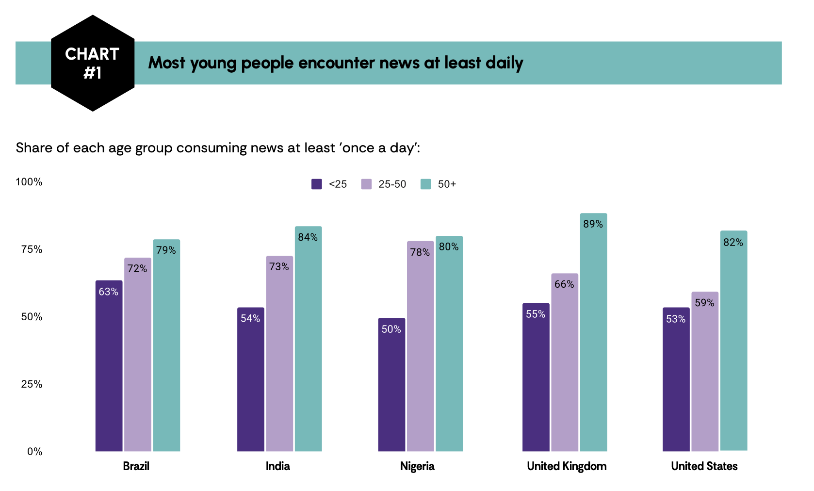 Cette étude repose sur l’analyse des modes de consommation d’information des 18-25 ans, dans cinq pays (Brésil, USA, UK, Inde, Nigéria). Avec un corpus de 1000 personnes interrogées par pays, via sondage et entretiens.