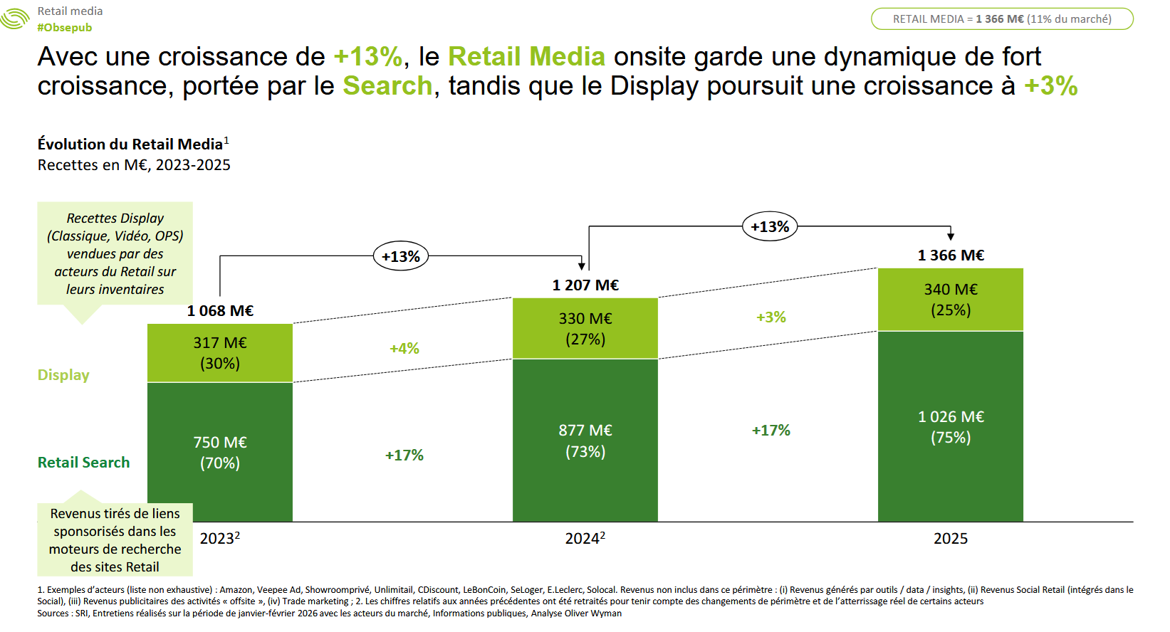Le Retail Media continue sa progression à+13 % (1,36 Md€), mais la dynamique interne change. Ce levier devient structurellement un marché de Search :