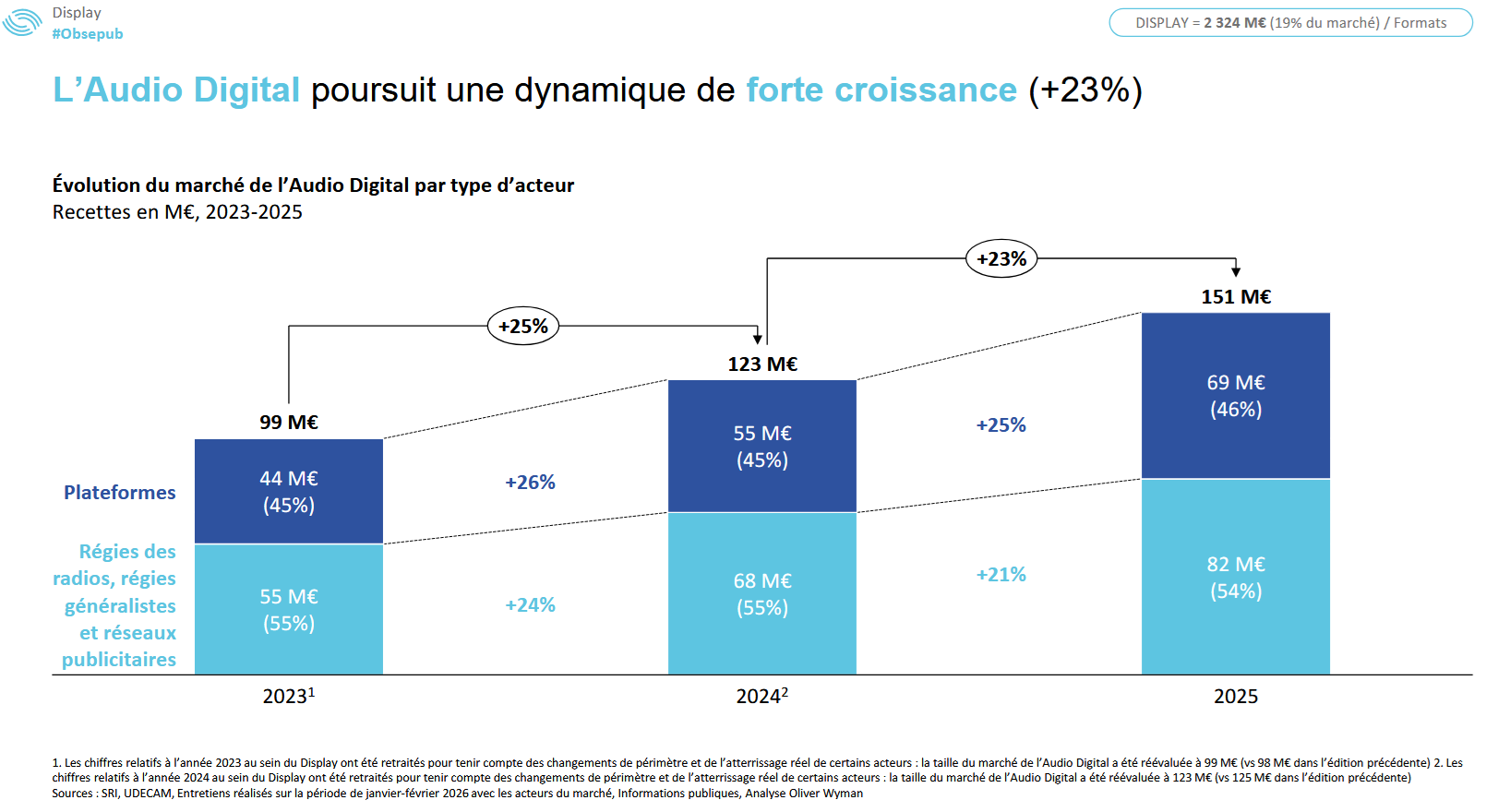 L’audio digital réalise une très bonne performance cette année. Alors que le marché global et le display croissent de +11 % respectivement, l’audio digital s’envole à +23 %. C’est une accélération notable par rapport aux années précédentes, portée par l’usage croissant du streaming et des podcasts.
