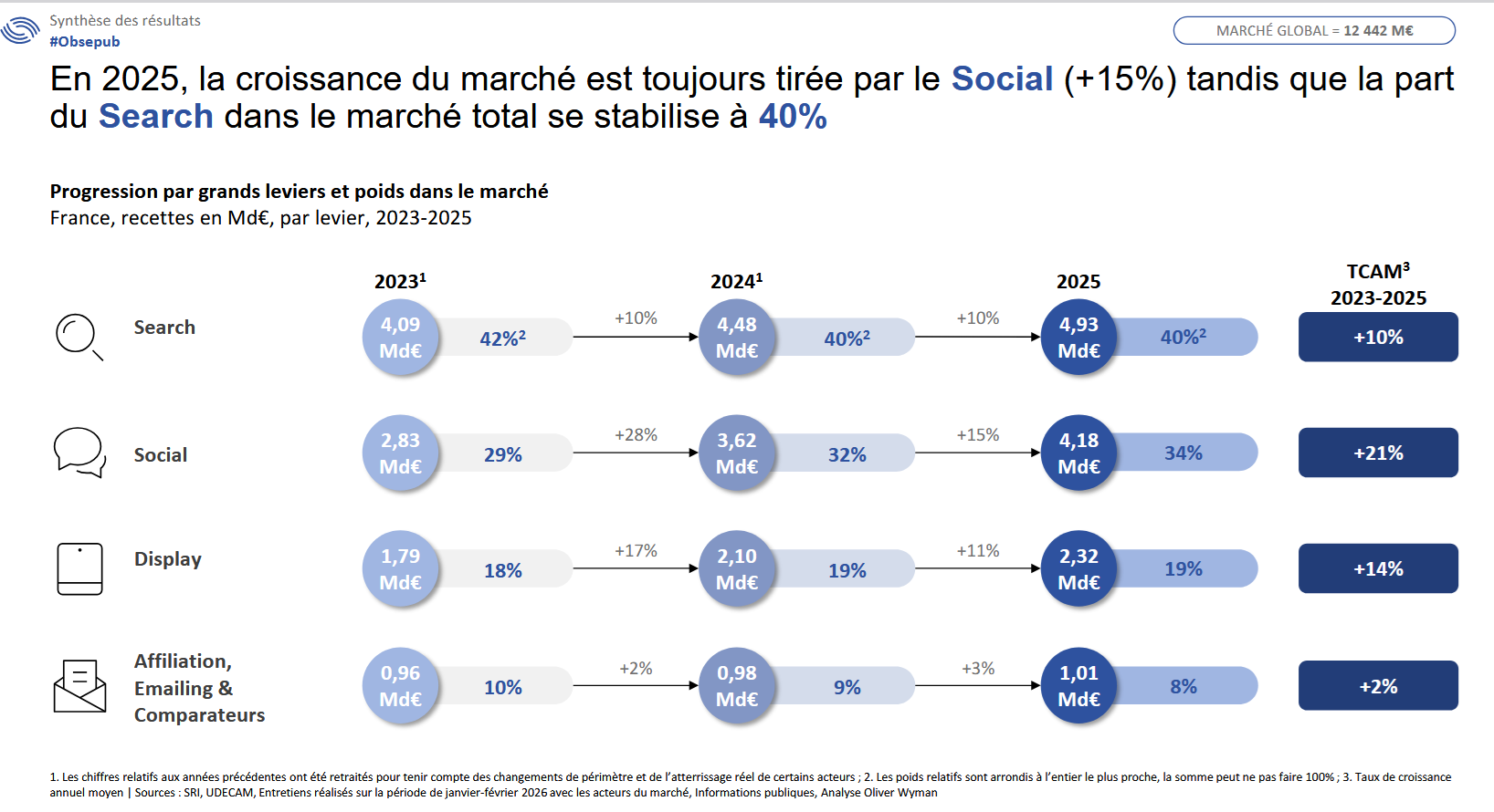 Porté par la vidéo, le social et l’essor continu du retail media, le marché français de la publicité digitale poursuit sa croissance en 2025 malgré un léger ralentissement après l’effet JO de 2024. Décryptage des chiffres de l'Observatoire de l’e-pub SRI, réalisé par Oliver Wyman, en partenariat avec l’UDECAM.