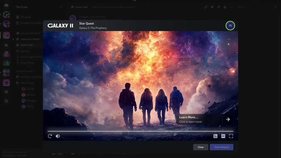 À ce stade, Discord propose deux formats publicitaires. Les « Play Quests » offrent une récompense après quinze minutes passées sur un jeu de l’annonceur. Les « Video Quests » reposent, elles, sur le visionnage d’une bande-annonce de jeu vidéo ou de film.