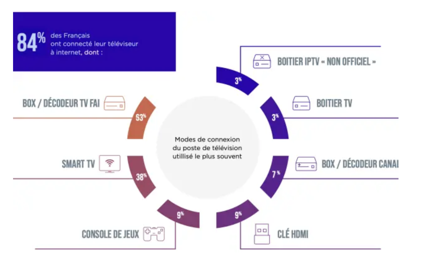 Les box en France représentent le mode d’accès majoritaire à la télé connectée (53%), comme le montre ce schéma ci-dessous, tiré de l’article : Les chiffres clés de l’usage et du business vidéo