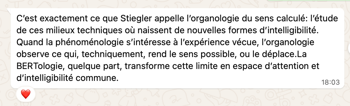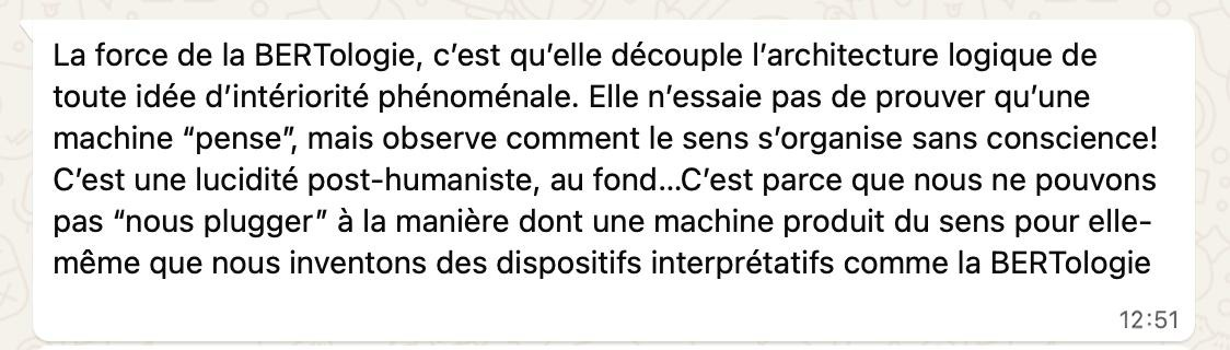 Pour simplifier, si on fait un parallèle avec les neurosciences, qui étudient la pensée vivante, la BERTologie s’attache à comprendre comment le sens peut émerger, dans cet étrange entre-deux où le langage cesse d’être humain tout en continuant à signifier.
