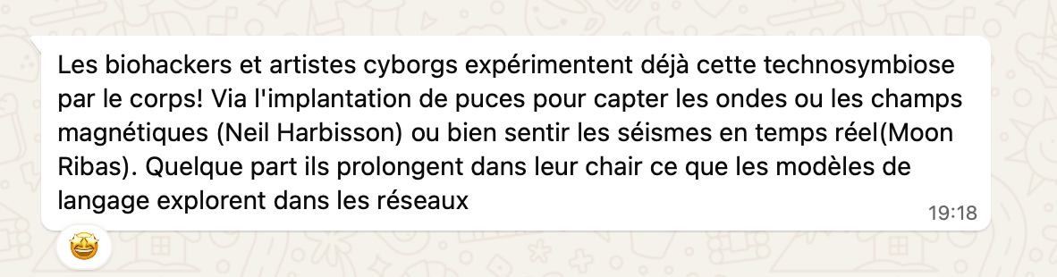 Ce qu’il faut bien comprendre, c’est qu’il ne faut pas confondre penser (avoir une expérience intérieure) avec produire du sens (organiser des relations signifiantes). C’est un point que j’ai exploré avec Ryslaine Moulay, directrice de l’innovation chez Maize, une société de conseil en prospective. Extraits de nos discussions sur WhatsApp :