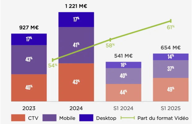 La CTV totalisait déjà 43% du display vidéo en 2024 et elle continue de prendre des parts de marché au secteur web. Au premier semestre 2025, la CTV représentait 49% de tous les supports vidéo (mobile, PC, CTV).