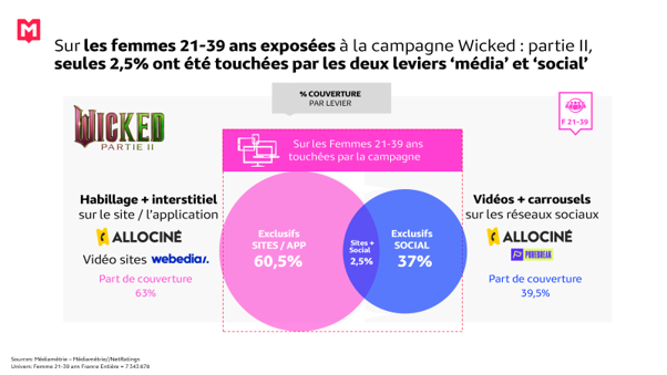 Menée en novembre 2025, l’étude réalisée pour le compte du groupe Webedia-Éléphant et d’Universal Pictures France concerne la campagne de promotion de la sortie du film Wicked : Partie II. Elle combine habillages et interstitiels sur le site et l’application AlloCiné, ainsi que sur le reste de l’écosystème de sites Webedia (vidéo), et des contenus de brand content diffusés sur les canaux Instagram et Facebook d’AlloCiné et de Purebreak.